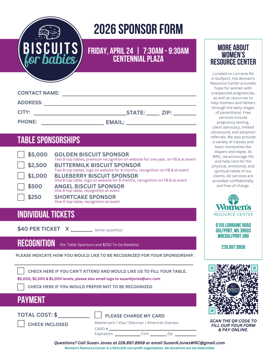 Sponsorships and tickets are available now for our 4th Annual Biscuits for Babies on the beautiful lawn of Centennial Plaza! Come spend the morning enjoying a delicious breakfast while mingling with your friends and learning more about what we do at the Women’s Resource Center! It was a sold out event for two years in a row, so get your table or ticket today! Just click the button below for our online registration.